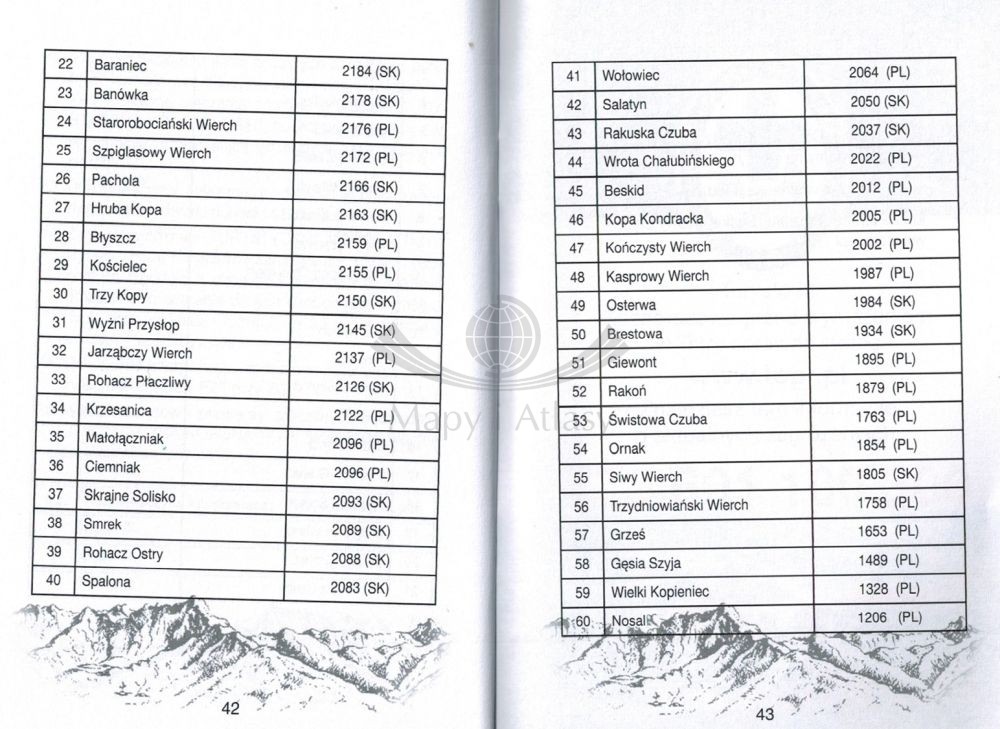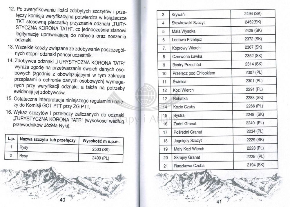 Książeczka zawiera regulamin odznaki "Turystyczna Korona Tatr", miejsce na zbieranie potwierdzeń oraz wykaz 60 szczytów i przełęczy.