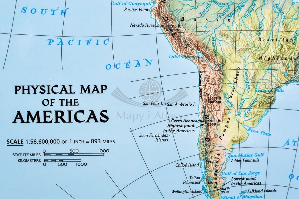 W lewym dolnym rogu umieszczono mapę fizyczną Ameryk w skali 1:56 600 000.