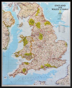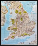 Mapa Anglii i Walii w skali 1:868 420 z elementami mapy fizycznej, drogowej i administracyjnej w wersji do wpinania. Stylizacja charakterystyczna dla National Geographic.