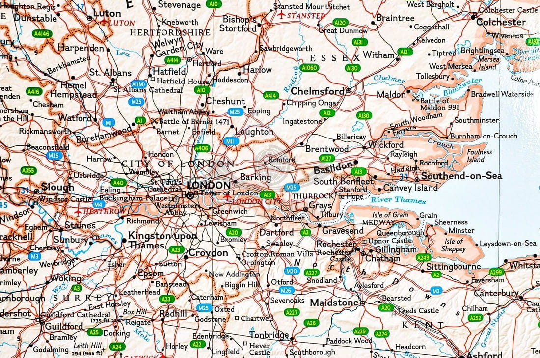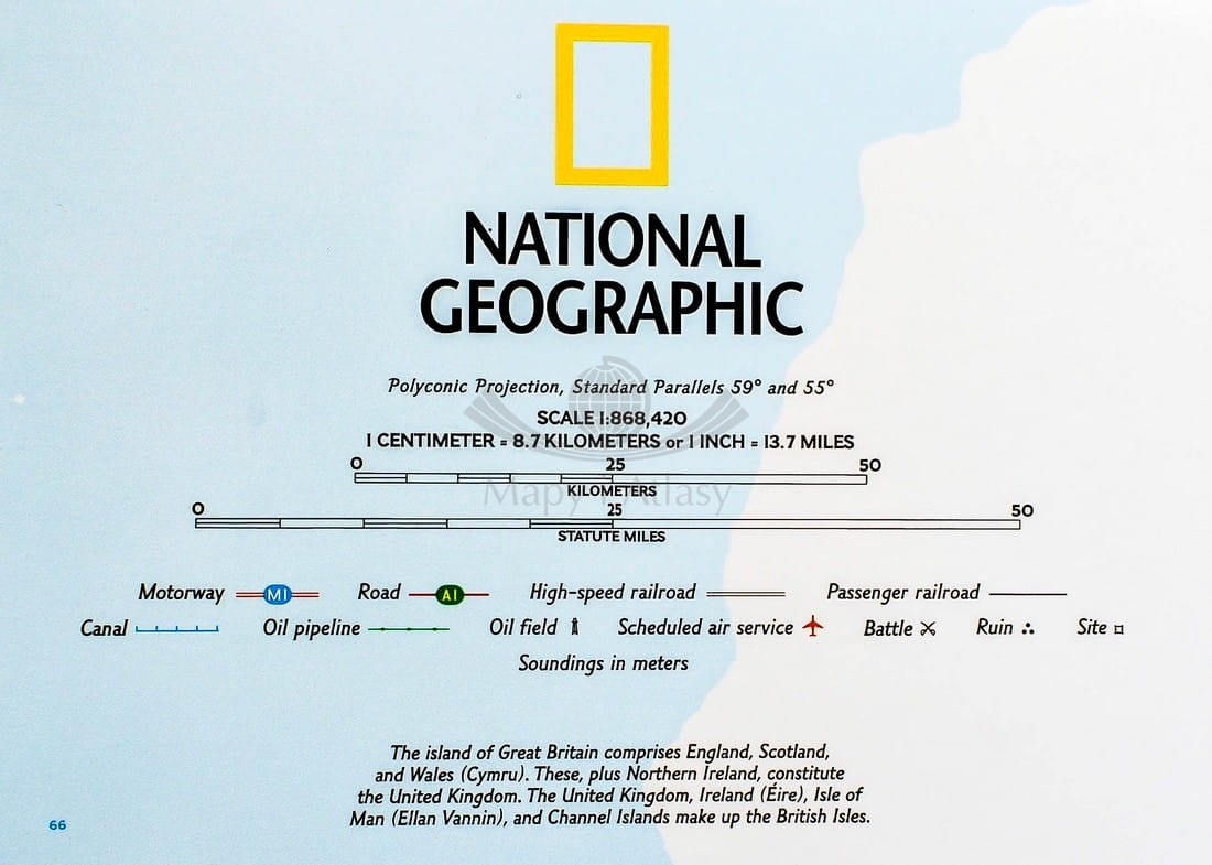Mapa Anglii i Walii w skali 1:868 420 z elementami mapy fizycznej, drogowej i administracyjnej w ramie drewnianej. Stylizacja charakterystyczna dla National Geographic.