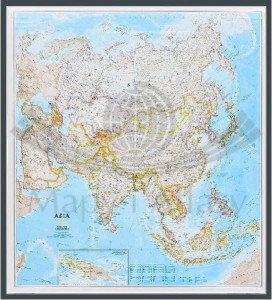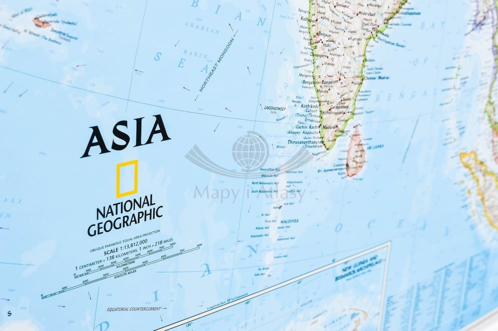 Mapa Azji w skali 1:13 812 000 wydawnictwa National Geographic w wersji do wpinania. Mapa zawiera informacje charakterystyczne zarówno dla mapy politycznej, jak i fizycznej.