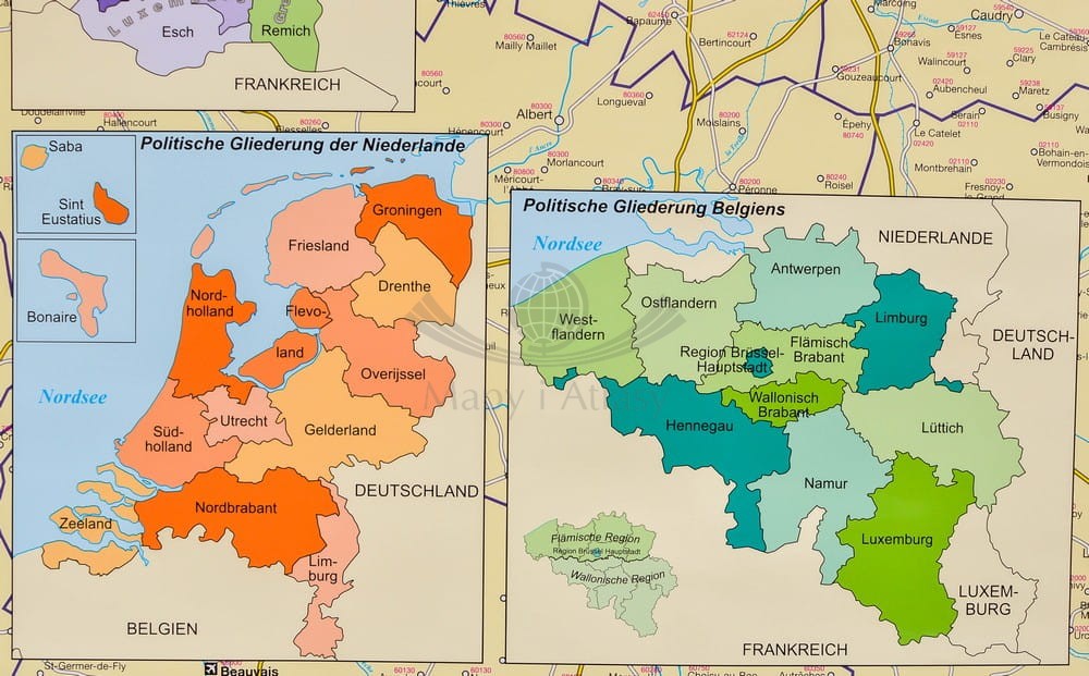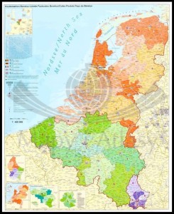 Benelux / Beneluks 1:420 000. Belgia, Holandia, Luksemburg. Mapa administracyjna w ramie drewnianej. Kody pocztowe. ST