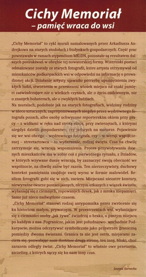 Zachęca do odkrywania wiejskich murali inspirowanych starą fotografią, historii dawnych mieszkańców wsi oraz odkrywania mniej znanych zakątków Bieszczad.