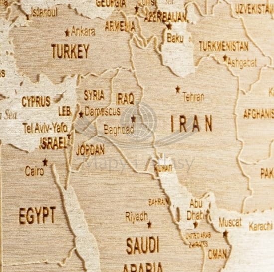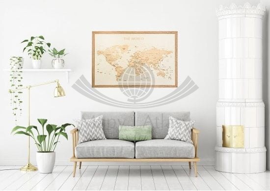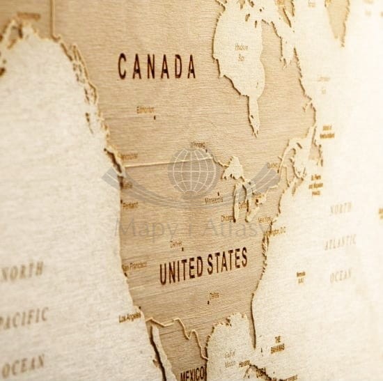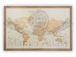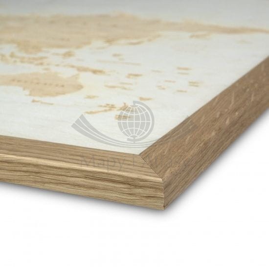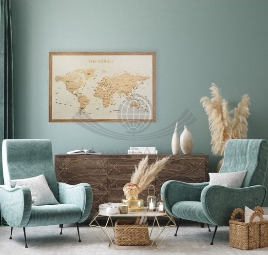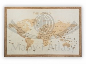 Jest to niezwykle efektowna i niebanalna alternatywa dla podróżników, wielbicieli stylu eko oraz wszystkich ceniących sobie ponadczasową estetykę. Polityczną mapę świata wykonano w sklejce z drewna brzozowego, a zastosowanie precyzyjnego, laserowego grawerowania umożliwiło zachowanie dużej ilości detali takich jak wypukłe granice państw lub linie brzegowe kontynentów.