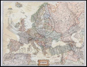 Mapa Europy w skali 1:5 419 000 z elementami mapy fizycznej, drogowej i administracyjnej w ramie drewnianej. Stylizacja charakterystyczna dla National Geographic. Na mapie zamieszczono główne drogi, pasażerskie linie kolejowe, kanały...