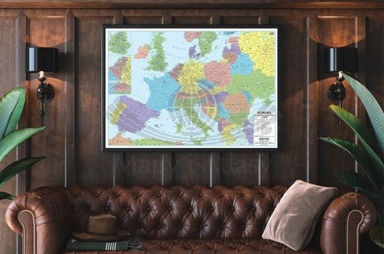Mapa gotowa do zawieszenia na ścianie jako tablica. Na czas transportu mapa jest zabezpieczana narożnikami z pianki i opakowaniem kartonowym.
