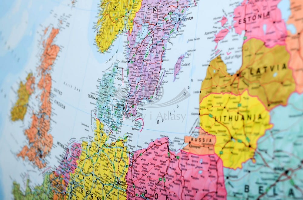 Mapa polityczna Europy w skali 1:4 300 000 z siecią dróg w wersji do wpinania wydawnictwa Maps International. Cieniowaniem zaznaczono ukształtowanie terenu. Żywe, wyraziste kolory, ogromna ilość szczegółów...