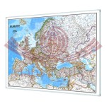 Mapa Europy w skali 1:8 399 000 z elementami mapy fizycznej, drogowej i administracyjnej w ramie. Stylizacja charakterystyczna dla National Geographic.