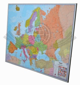 Polityczna mapa Europy w skali 1:4 300 000 z siecią dróg wydawnictwa Maps International w ramie aluminiowej. Cieniowaniem zaznaczono ukształtowanie terenu. Żywe, wyraziste kolory, duża ilość szczegółów...