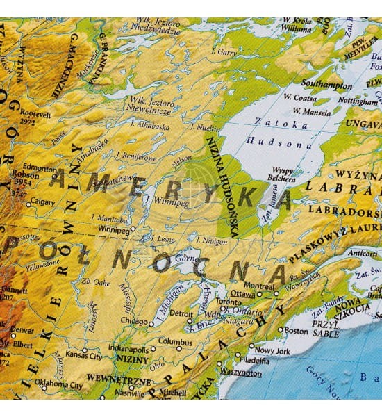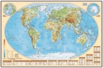 Mapa fizyczna świata w skali 1:60 000 wydawnictwa EKO-GRAF w ramie drewnianej. Mapa ukazuje także ukształtowanie powierzchni obu biegunów w skali 1:102 000 000. Dodatkowo mapa zawiera tabele...