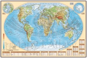 Mapa ukazuje także ukształtowanie powierzchni obu biegunów w skali 1:102 000 000. Dodatkowo mapa zawiera tabele z najważniejszymi informacjami dotyczącymi oceanów, poszczególnych kontynentów, oraz największych wysp, półwyspów, pustyń, szczytów górskich, jezior, rzek i wodospadów.