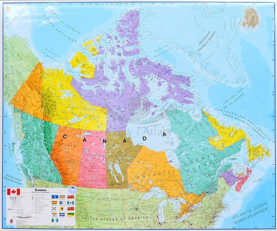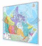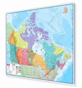 Ścienna mapa polityczna Kanady w skali 1:4 850 000 z zaznaczoną siecią dróg w ramie aluminiowej. Cieniowaniem zaznaczono ukształtowanie terenu. Piękne, żywe, wyraziste kolory.