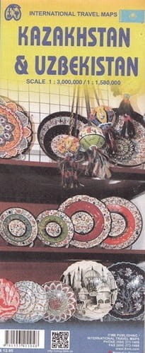 Dwustronna, składana mapa samochodowa Uzbekistanu w skali 1:1 580 000 oraz Kazachstanu w skali 1:3 000 000. Legenda w języku angielskim.