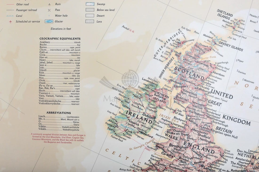 Mapa Europy z elementami mapy fizycznej, drogowej i administracyjnej w skali 1:5 419 000 w wersji magnetycznej. Stylizacja charakterystyczna dla National Geographic.