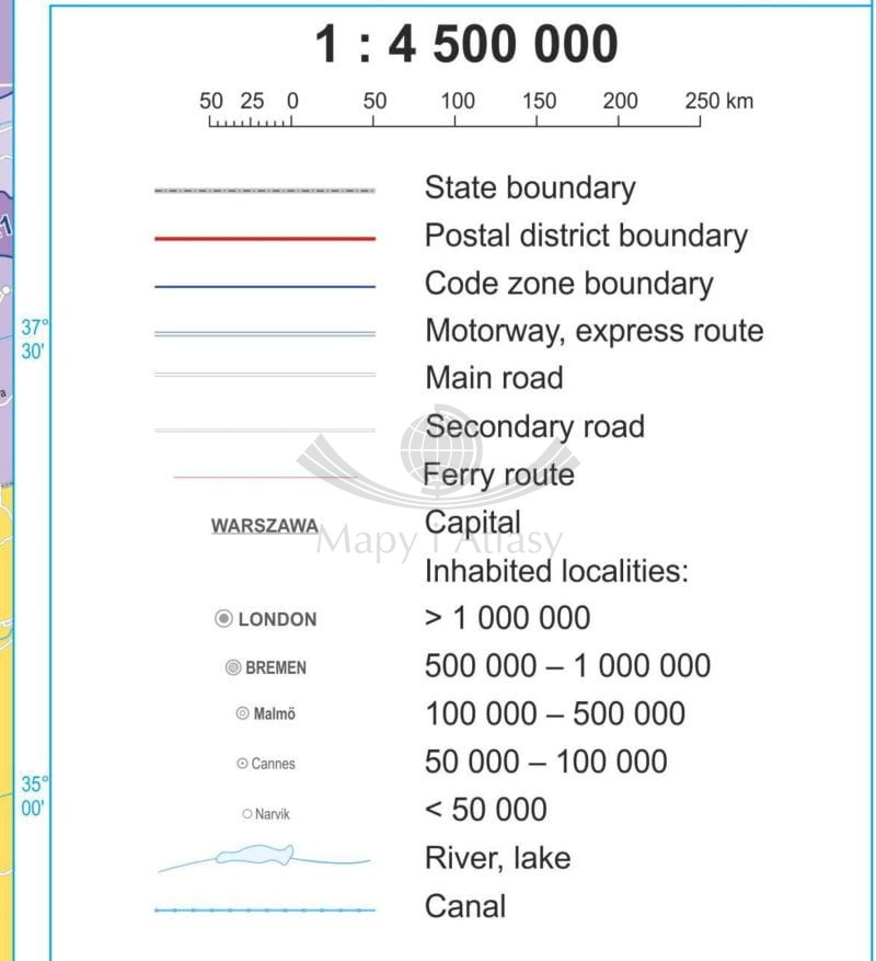Europa 1:4 500 000. Mapa. Kody pocztowe. Język angielski. Wersja magnetyczna