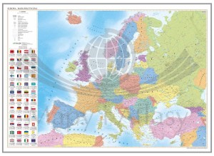 Mapa ukazuje aktualny podział polityczny Europy. Dodatkowo umieszczono na niej flagi poszczególnych państw europejskich wraz z: nazwą stolicy, powierzchnią, liczbą ludności, językiem urzędowym.