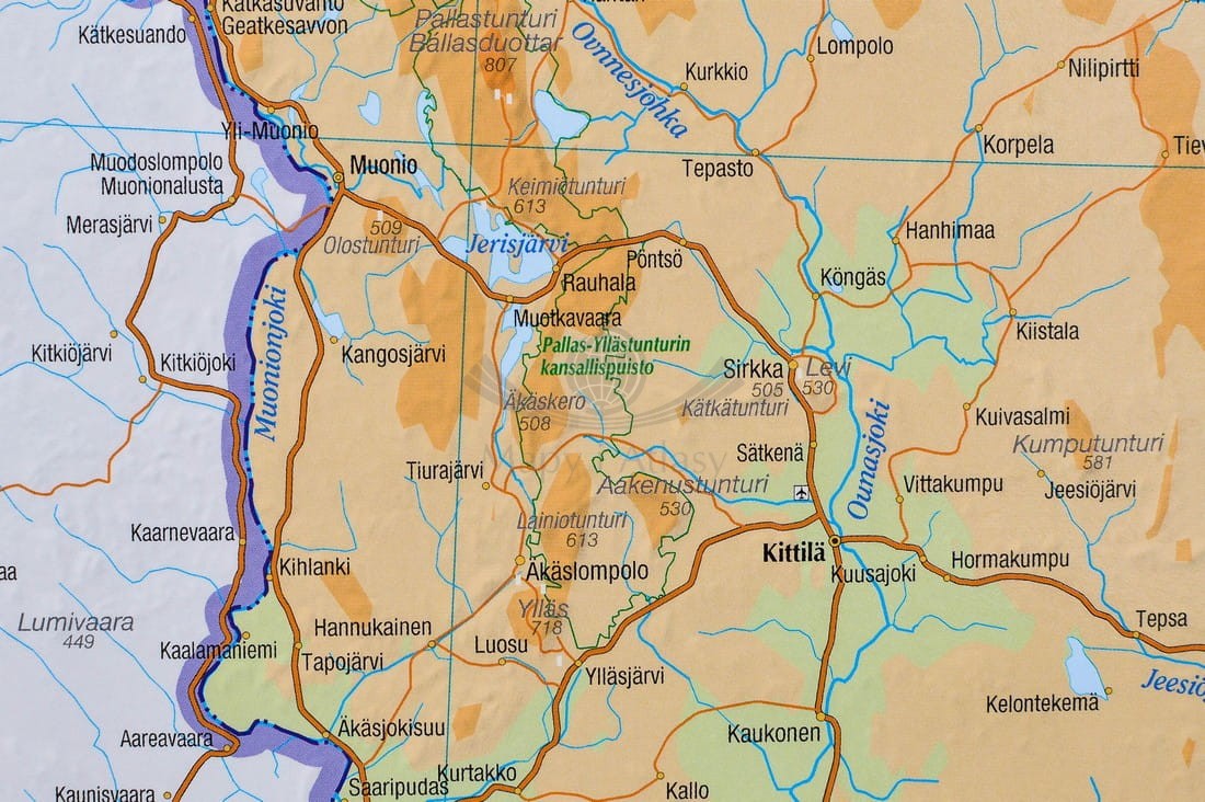 Drogowo-fizyczna mapa Finlandii w skali 1:1 000 000 wydawnictwa Karttakeskus w wersji magnetycznej. Na mapie zaznaczono m.in.: autostrady, drogi, miasta, granice państw, granice administracyjne, linie kolejowe, lotniska...