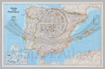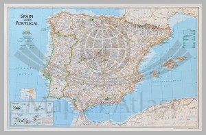 Mapa Hiszpanii i Portugalii z elementami mapy fizycznej, drogowej i administracyjnej w skali 1:2 074 000 w wersji magnetycznej. Stylizacja charakterystyczna dla National Geographic. Na mapie dodano mapki Madery, Azorów i Wysp Kanaryjskich.