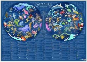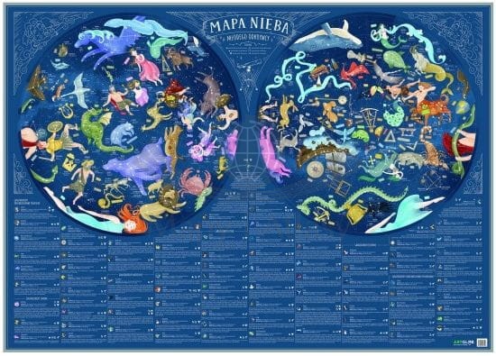 W dolnej części mapy znajduje się legenda, będąca zbiorem informacji dobranych tak, by w prosty sposób opowiedzieć o fascynującym, kosmicznym świecie. Gwarancja, że Mapa Nieba dla dzieci znacznie ułatwi naukę w domowych warunkach oraz dopełni treści zdobyte w szkolnej ławce, na ścianie zwiśnie jako wymarzona ozdoba każdego pokoju, a przewiązana wstążką będzie wymarzonym prezentem dla pociechy.