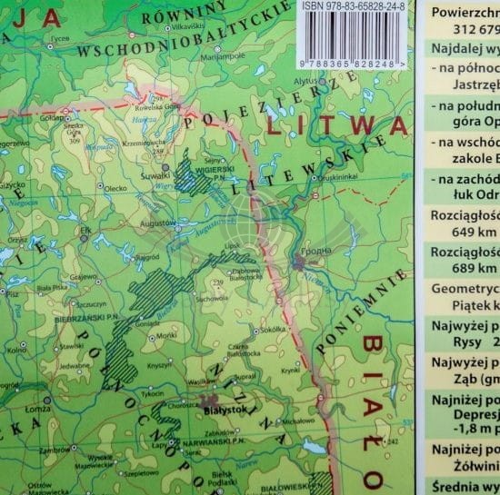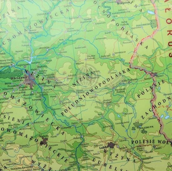 Przedstawia ukształtowanie powierzchni Polski w postaci klasycznej siatki poziomic, dodatkowo podkreślona jest to atrakcyjnym wizualnie cieniowaniem. Mapa zawiera również szeroką informację przedstawiającą krainy geograficzne, a także główne drogi. Dodatkowo naniesiono obszary parków narodowych i punktowo parki krajobrazowe waz z ich opisem.Klasyczna kolorystyka, czytelność i najwyższa jakość edytorska dopełnia całości. Mapa jest idealną pomocą dydaktyczną dla uczniów i studentów, jak również przyjemną ozdobą każdego wnętrza.