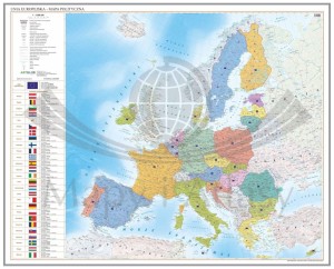 Mapa ukazuje aktualny podział polityczny Europy. Dodatkowo umieszczono na niej flagi poszczególnych państw należących do wspólnoty wraz z: nazwą stolicy, powierzchnią, liczbą ludności, językiem urzędowym, walutą, datą wstąpienia do EWG/UE.
