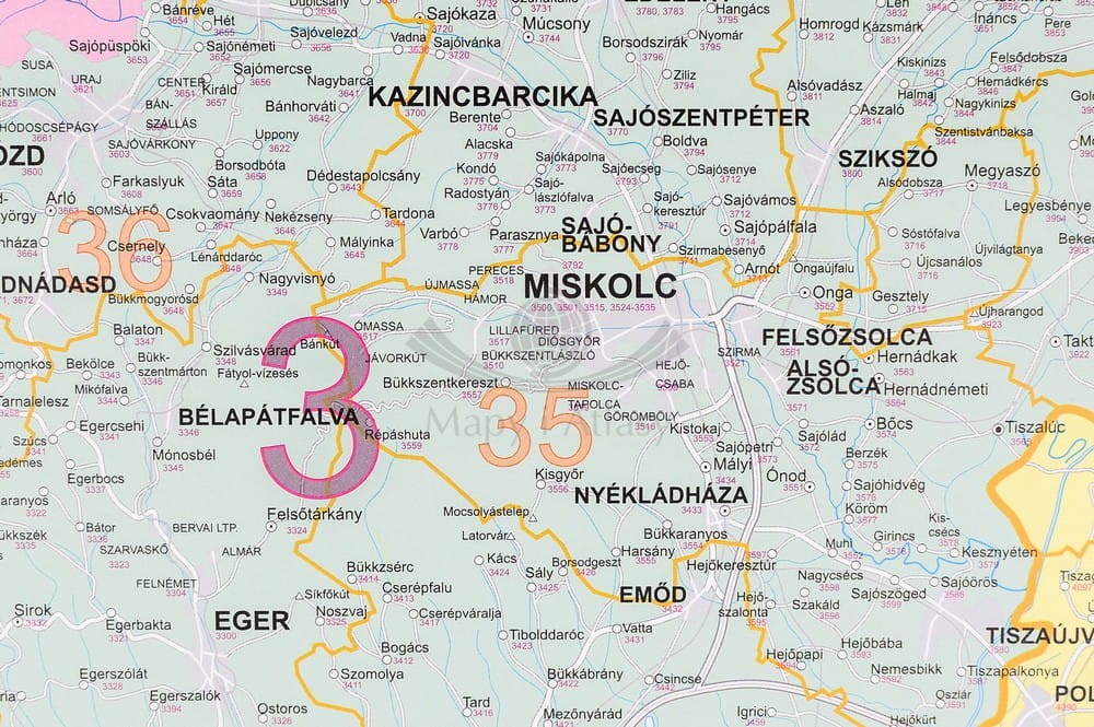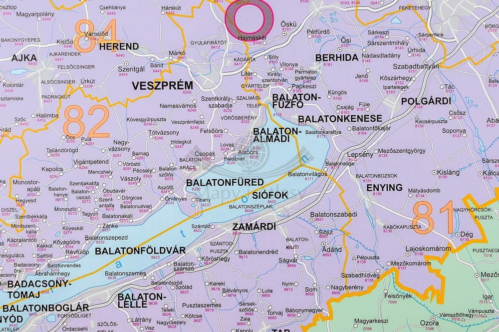 Mapa Węgier z kodami pocztowymi w skali 1:400 000 w wersji magnetycznej. Ukazuje podział na obszary odpowiadające jednej i dwu cyfrom kodu pocztowego. Dodatkowo umieszczono pełne kody pocztowe dla każdej miejscowości widocznej na mapie...
