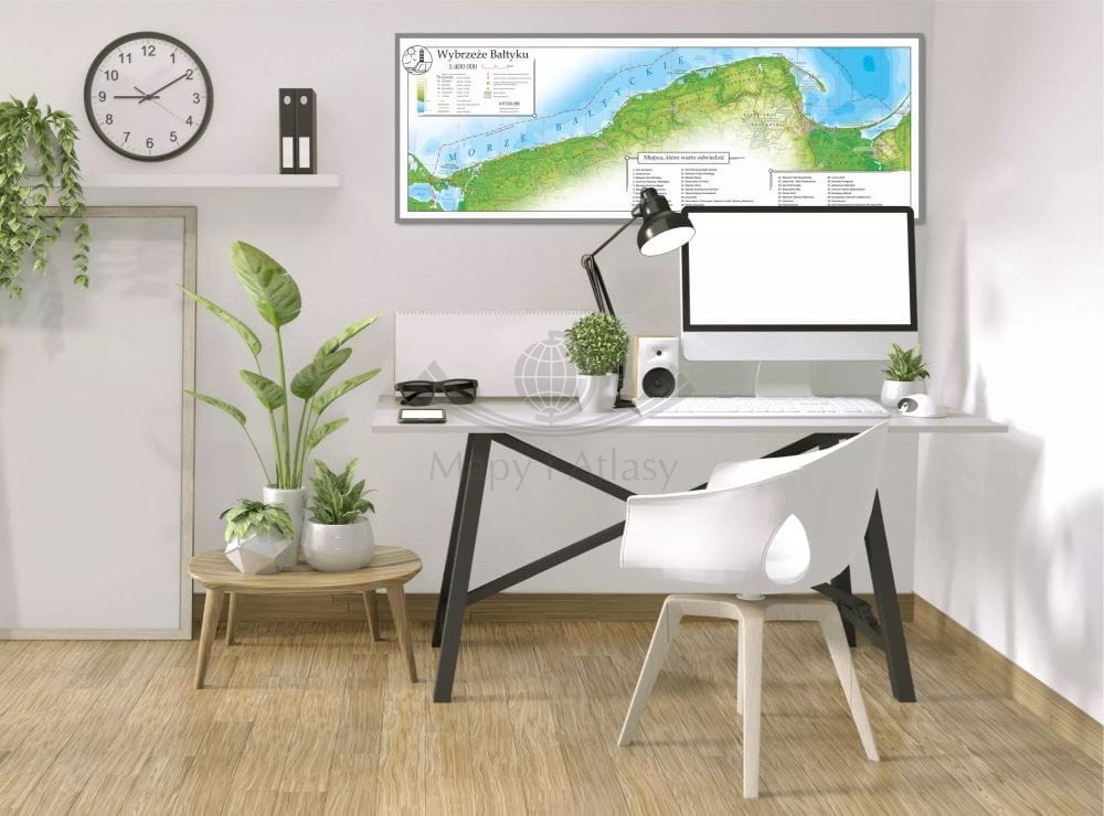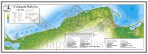 Mapa obejmuje całe wybrzeże Bałtyku, od Świnoujścia po Mierzeję Wiślaną, uwzględniając zarówno główne miejscowości turystyczne, jak i mniejsze, mniej znane atrakcje. Wyraźne oznaczenie kolorystyczne, które przedstawia różnice w wysokości pozwala na dokładne odwzorowanie ukształtowania nadmorskiego krajobrazu.