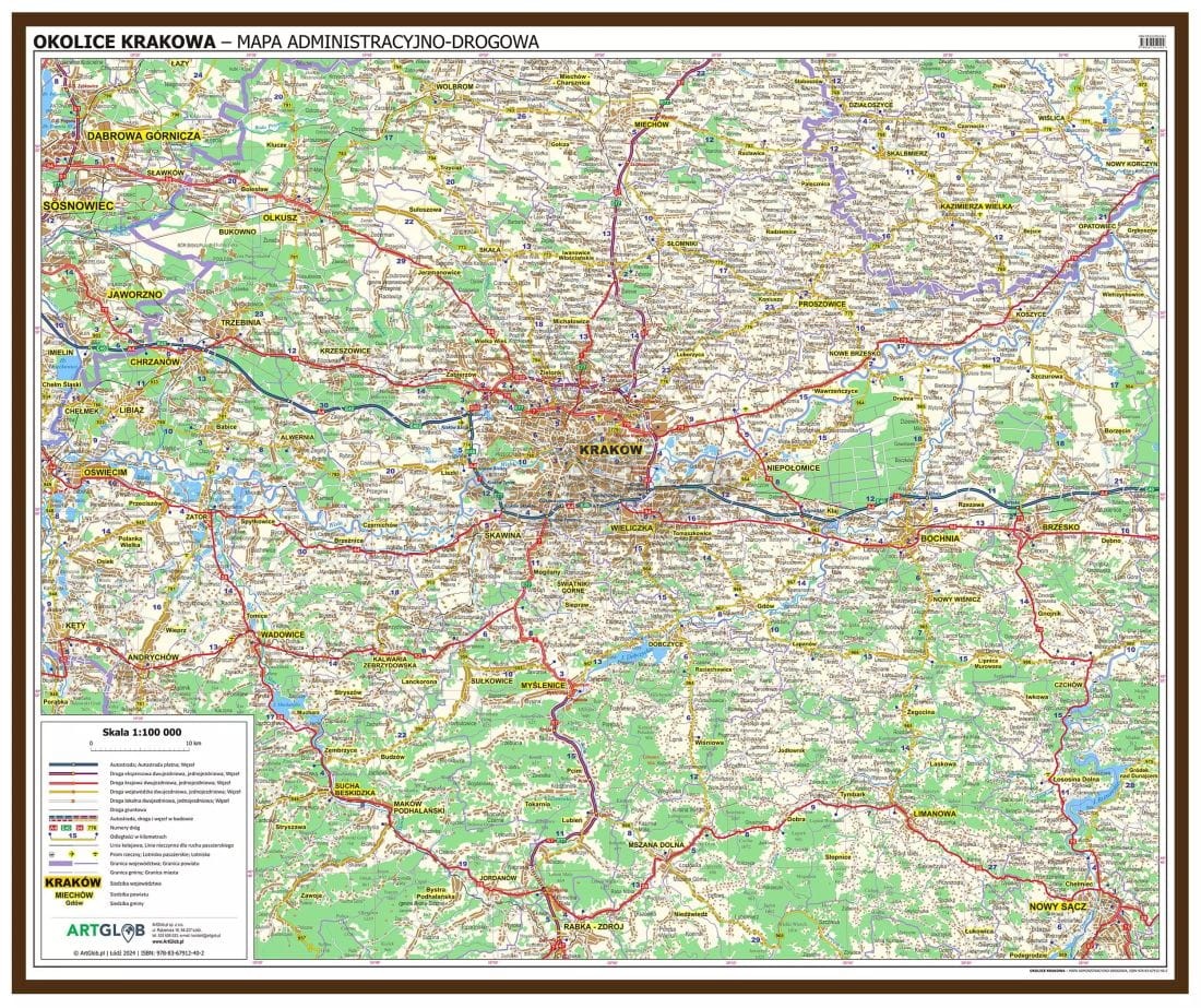 Administracyjno-drogowa mapa okolic Krakowa w skali 1:100 000 w ramie drewnianej wydawnictwa ArtGlob.
