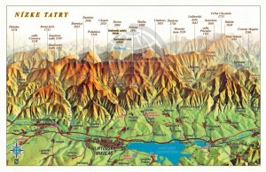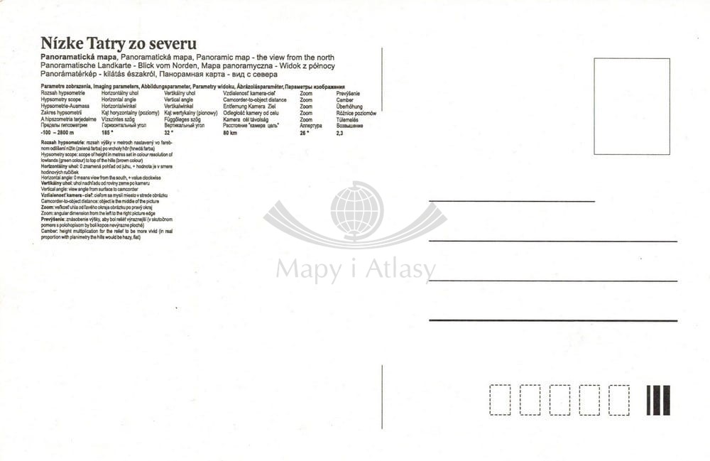 Mapa panoramiczna części zachodniej Niżnych Tatr sprawiająca wrażenie efektu 3D, w formie pocztówki o wymiarach 21,5 x 14 cm. Prezentuje widok z północy. Na panoramie opisano najwyższe szczyty oraz miejscowości. Zaznaczono także drogi, rzeki i jeziora.