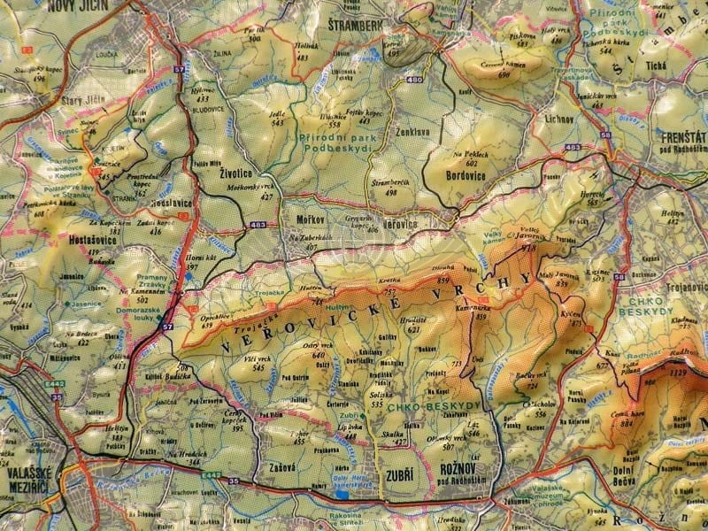 Mapa przedstawia część Beskidów leżącą na terenie Czech oraz przyległe pasma lub ich części, a więc przede wszystkim Beskid Śląsko-Morawski oraz Góry Wsetyńskie, Góry Hostyńskie, Wysokie Jaworniki, Niskie Jaworniki, Beskid Śląski.