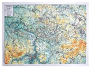 Mapa wykonana z giętkiego tworzywa. Wzniesienia lądów zaznaczone odpowiednimi wypukłościami na mapie.