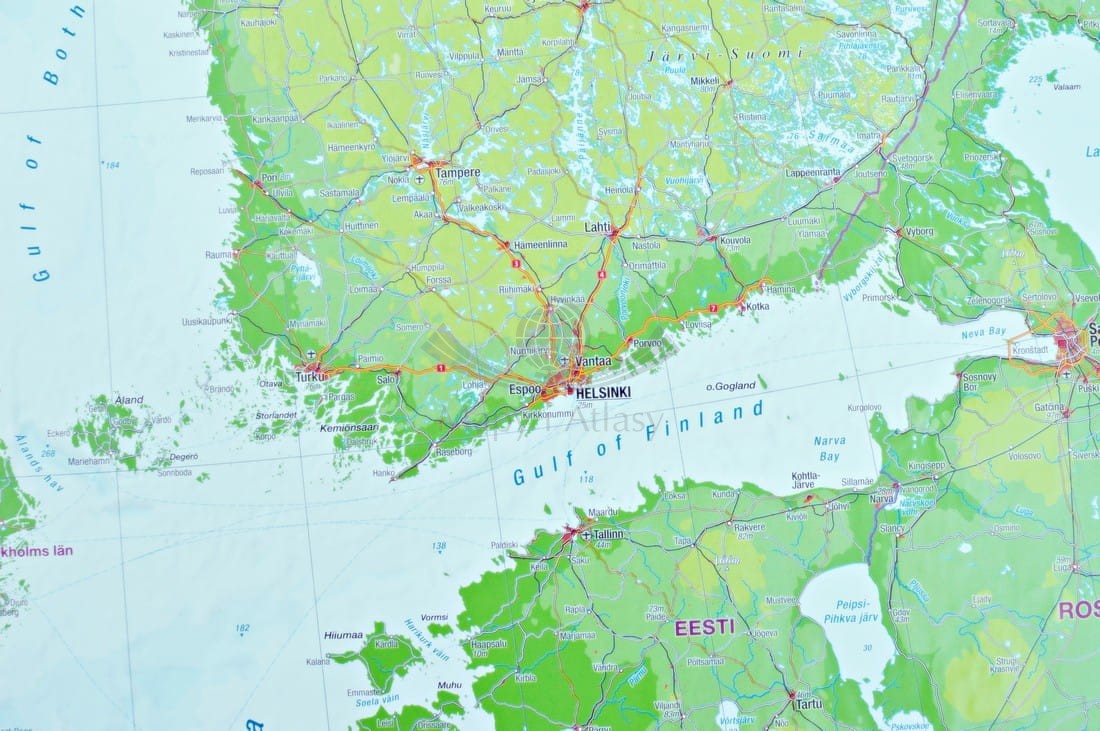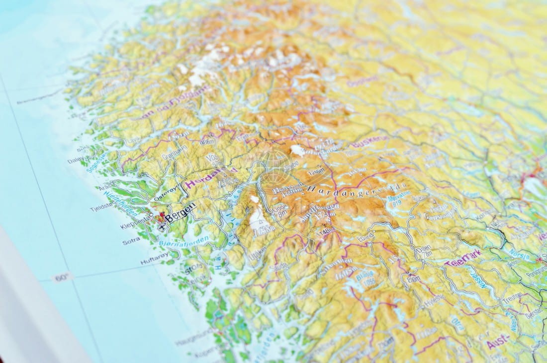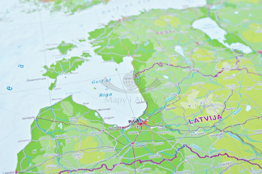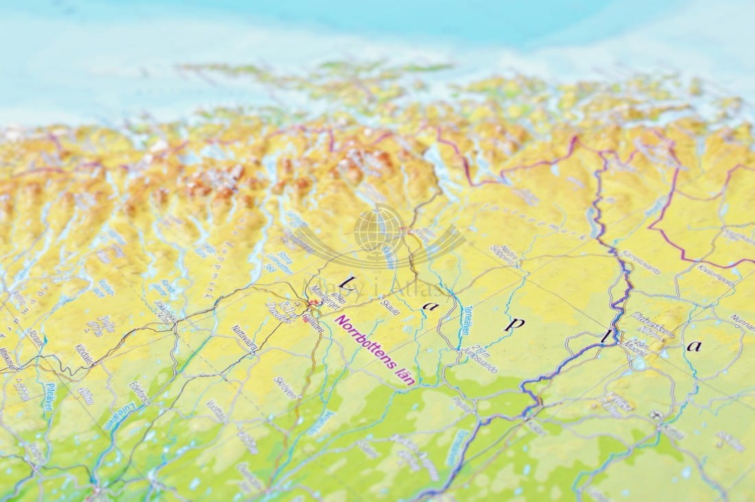 Plastyczna (3D) mapa Skandynawii w skali 1:2 900 000 wydawnictwa Georelief. Mapa obejmuje kraje: Szwecja, Norwegia, Finlandia, Litwa, Łotwa, Estonia, Dania.