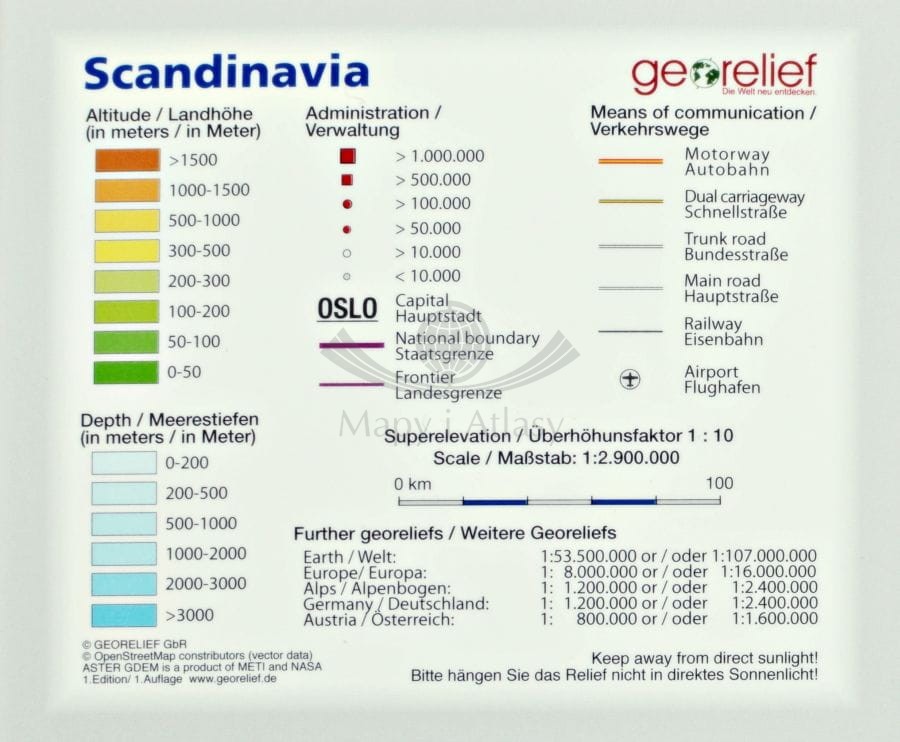 Plastyczna (3D) mapa Skandynawii w skali 1:2 900 000 wydawnictwa Georelief. Mapa obejmuje kraje: Szwecja, Norwegia, Finlandia, Litwa, Łotwa, Estonia, Dania