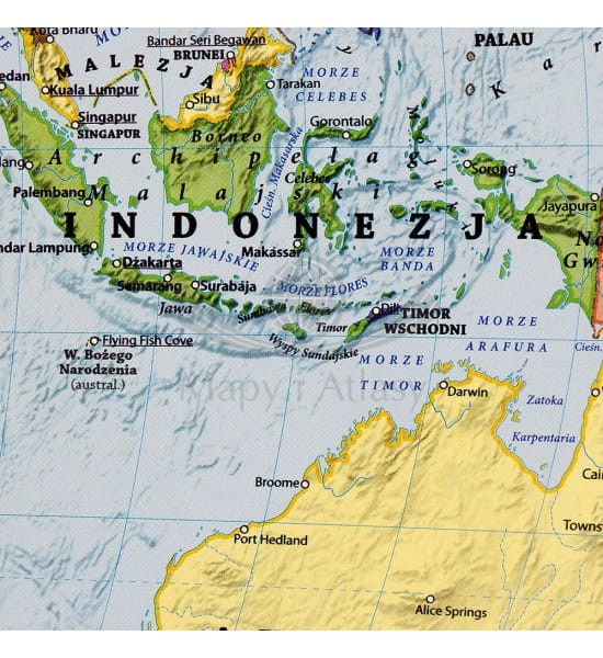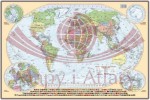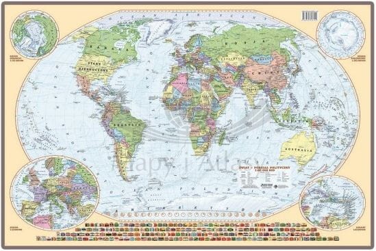 Mapa polityczna świata w skali 1:60 000 wydawnictwa EKO-GRAF w ramie drewnianej. Dodatkowo zamieszczono mapy obu biegunów w skali 1:102 000 000 oraz mapy Karaibów i Europy w skali 1:32 000 000...