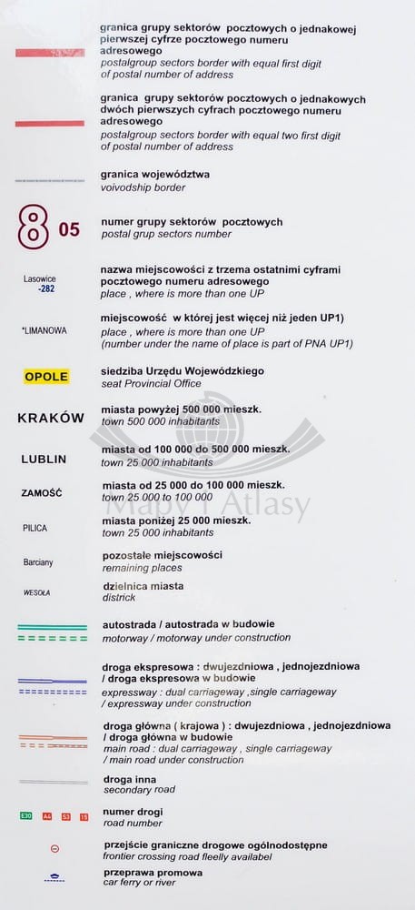 Mapa kodowa Polski w skali 1:500 000 z podstawową siecią dróg w wersji do wpinania. Na mapie zaznaczono m.in.: drogi, numery dróg, drogowe przejścia graniczne, przeprawy promowe, granice grupy sektorów pocztowych...