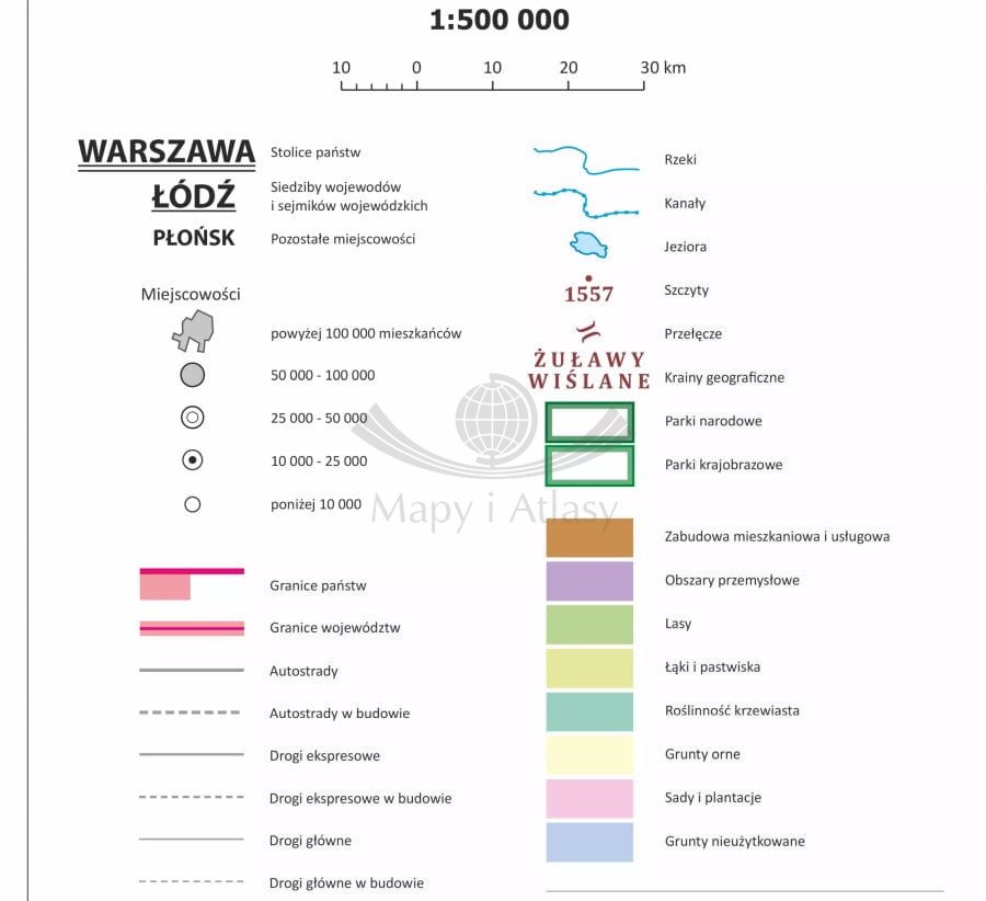 - przejrzystą legendę wyjaśniającą zastosowane symbole, od granic administracyjnych po rodzaje krajobrazu,