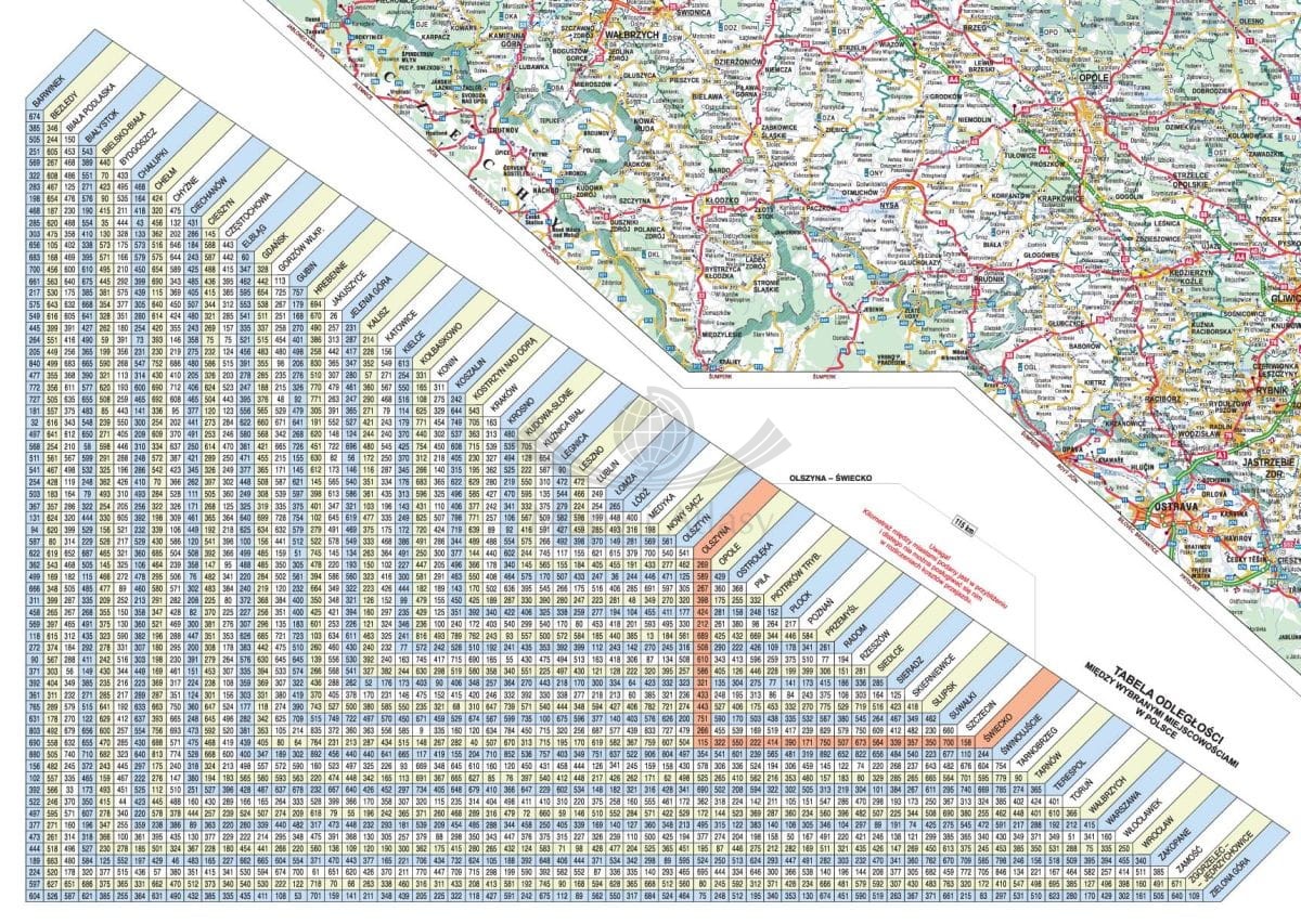 Mapa samochodowa Polski w skali 1:500 000 w wersji do wpinania wydawnictwa Piętka. W lewym dolnym rogu zamieszczono tabelę odległości między wybranymi miejscowościami.