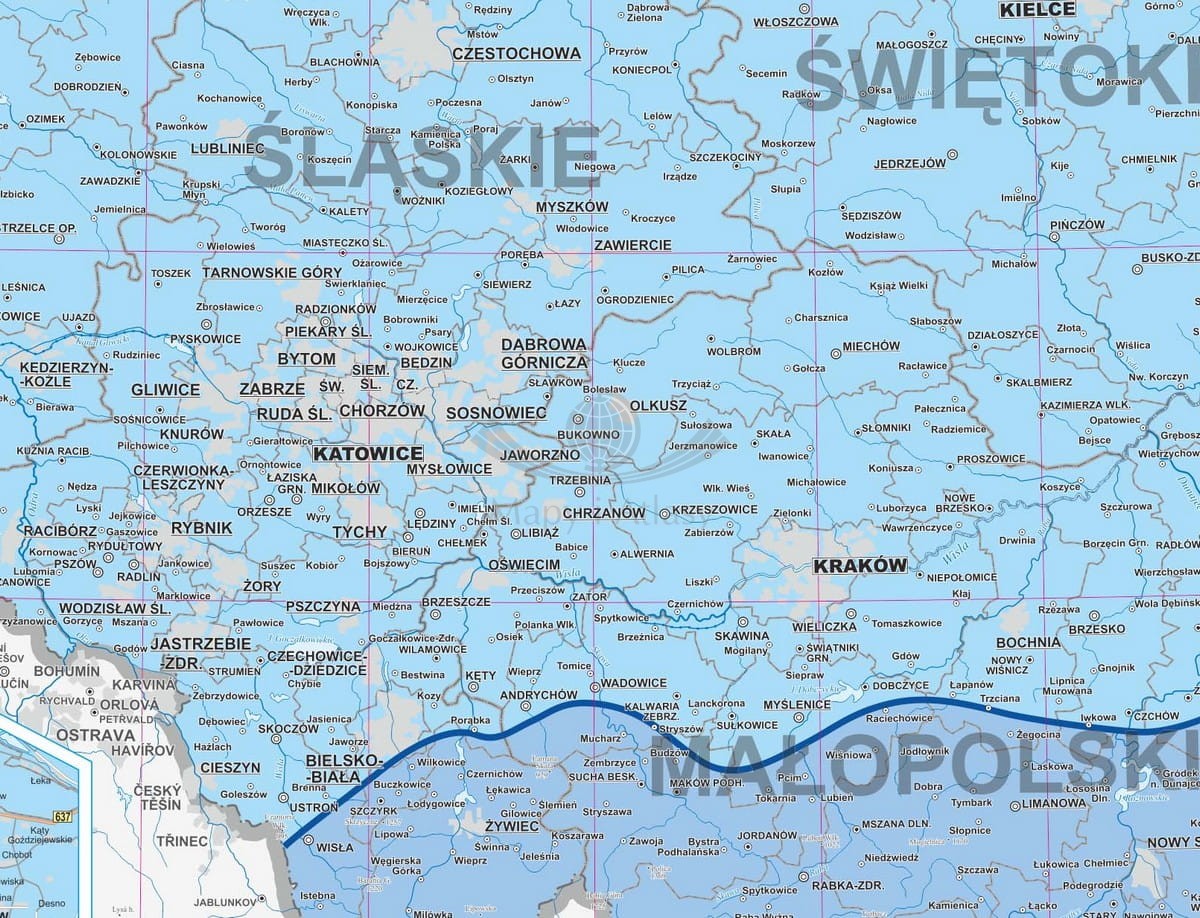 Podział administracyjny uwzględniający granice województw i powiatów. Rzeki i zbiorniki wodne, zbiór miejscowości taki sam jak na odpowiedniej mapie administracyjno-drogowej.
