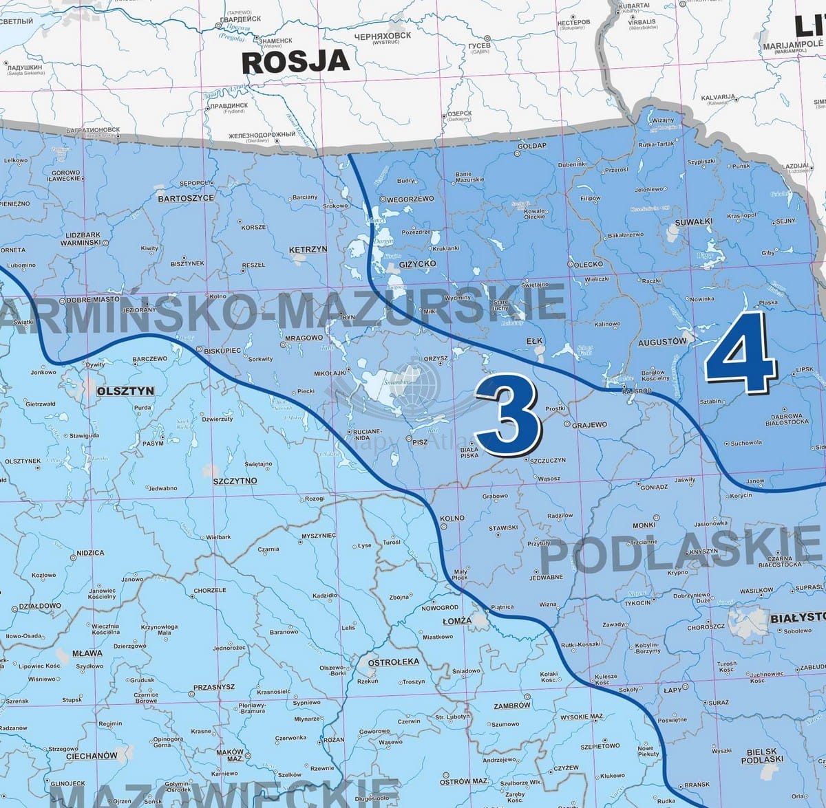 Mapa ścienna Polski z podziałem na strefy przemarzania gruntu. Strefy przemarzania gruntu wg PN-81/B-03020. Strefy oznaczone odcieniami koloru niebieskiego i ponumerowane.