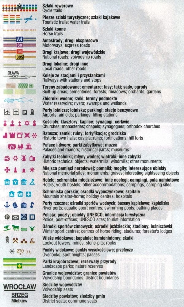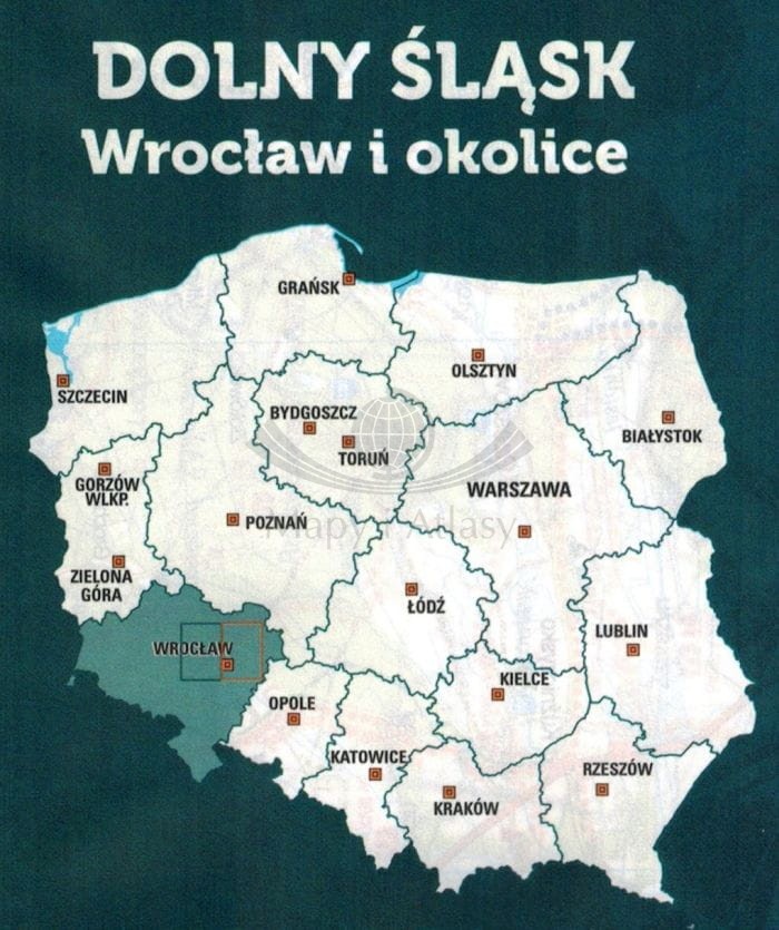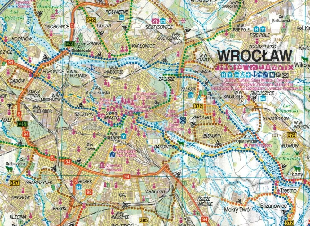 Wodoodporna i odporna na rozdarcie, składana mapa turystyczna tras rowerowych wschodniej części okolic Wrocławia w skali 1:100 000.