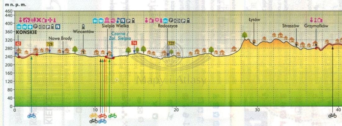 Mapa zawiera również schemat nachylenia terenu wzdłuż szlaku wraz z zaznaczonymi informacjami turystycznymi.
