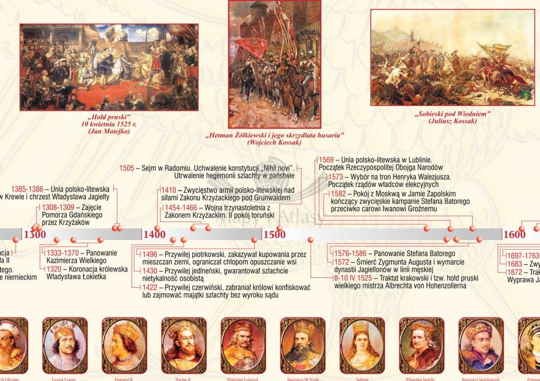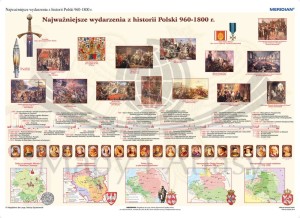 Plansza edukacyjna przedstawiająca najważniejsze wydarzenia historii Polski w latach 966-1800, naniesione na oś czasu. Materiał faktograficzny uzupełniają portrety władców oraz ilustracje przedstawiające najważniejsze wydarzenia i postaci naszych dziejów.