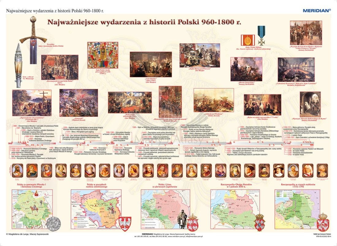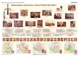 Plansza edukacyjna przedstawiająca najważniejsze wydarzenia historii Polski w latach 966-1800, naniesione na oś czasu. Materiał faktograficzny uzupełniają portrety władców oraz ilustracje przedstawiające najważniejsze wydarzenia i postaci naszych dziejów.