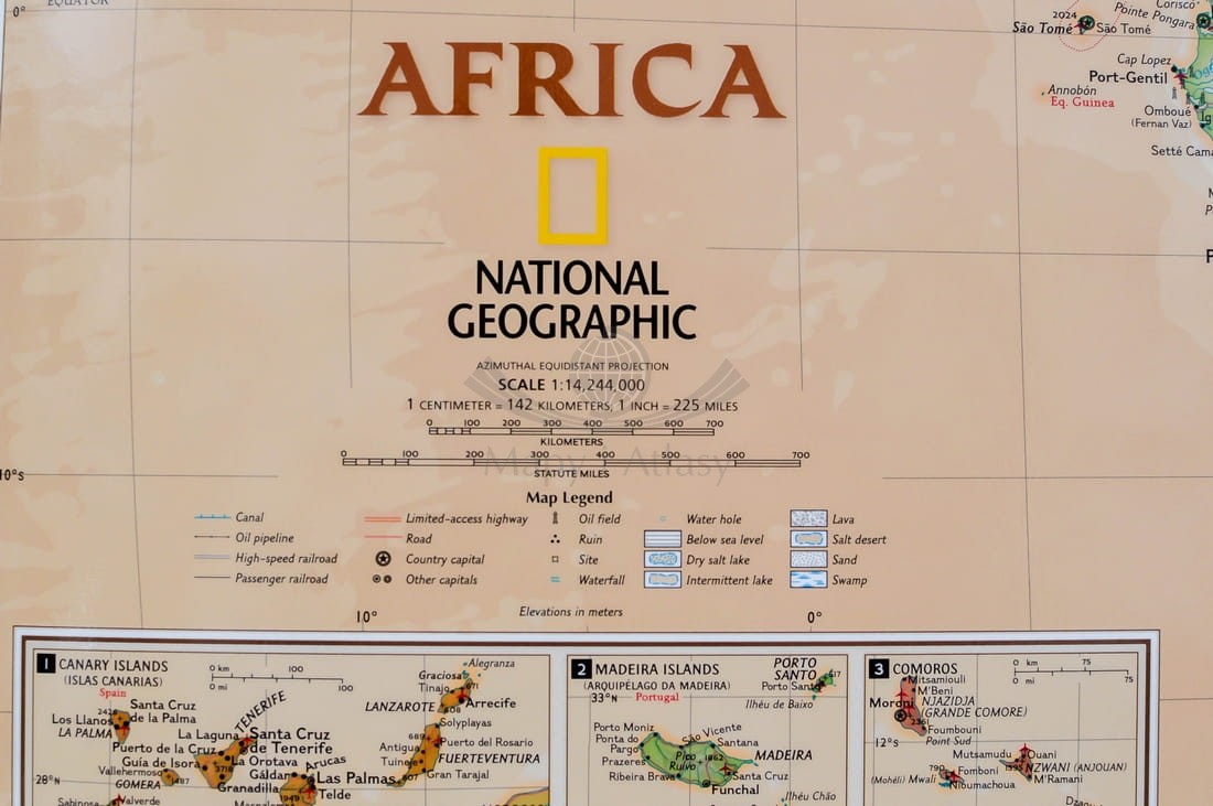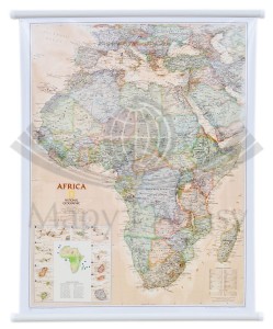 Ścienna mapa Afryki w skali 1:14 244 000 w wersji ekskluzywnej (w odcieniach brązu) wydawnictwa National Geographic. Mapa zawiera informacje charakterystyczne zarówno dla mapy politycznej, jak i fizycznej.