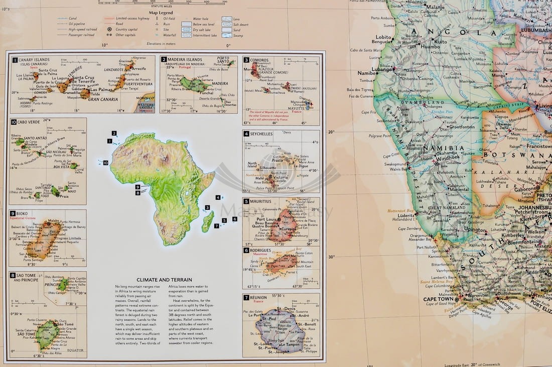 Publikacja zawiera również karton boczny z dodatkowymi mapami: Wyspy Kanaryjskie, Madera, Komory, Seszele, Mauritius, Rodrigues, Reunion, Wyspy Świętego Tomasza i Książęca, Bioko, Wyspy Zielonego Przylądka.