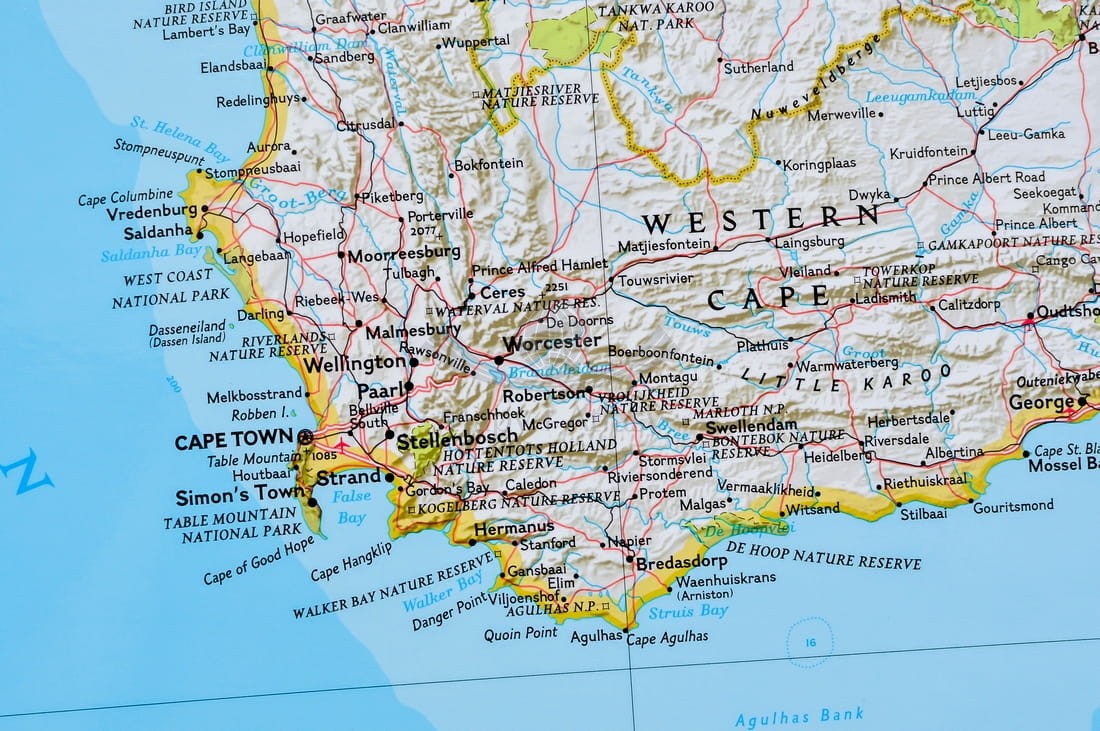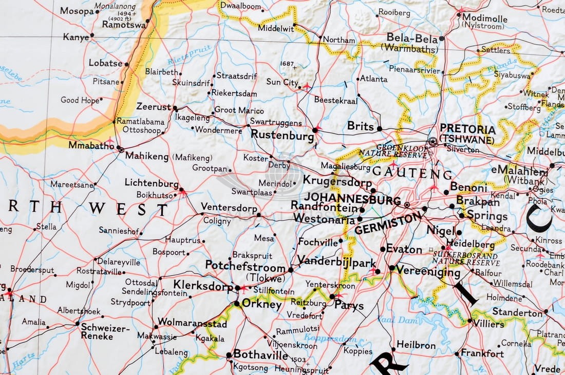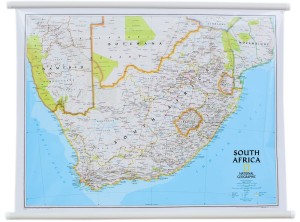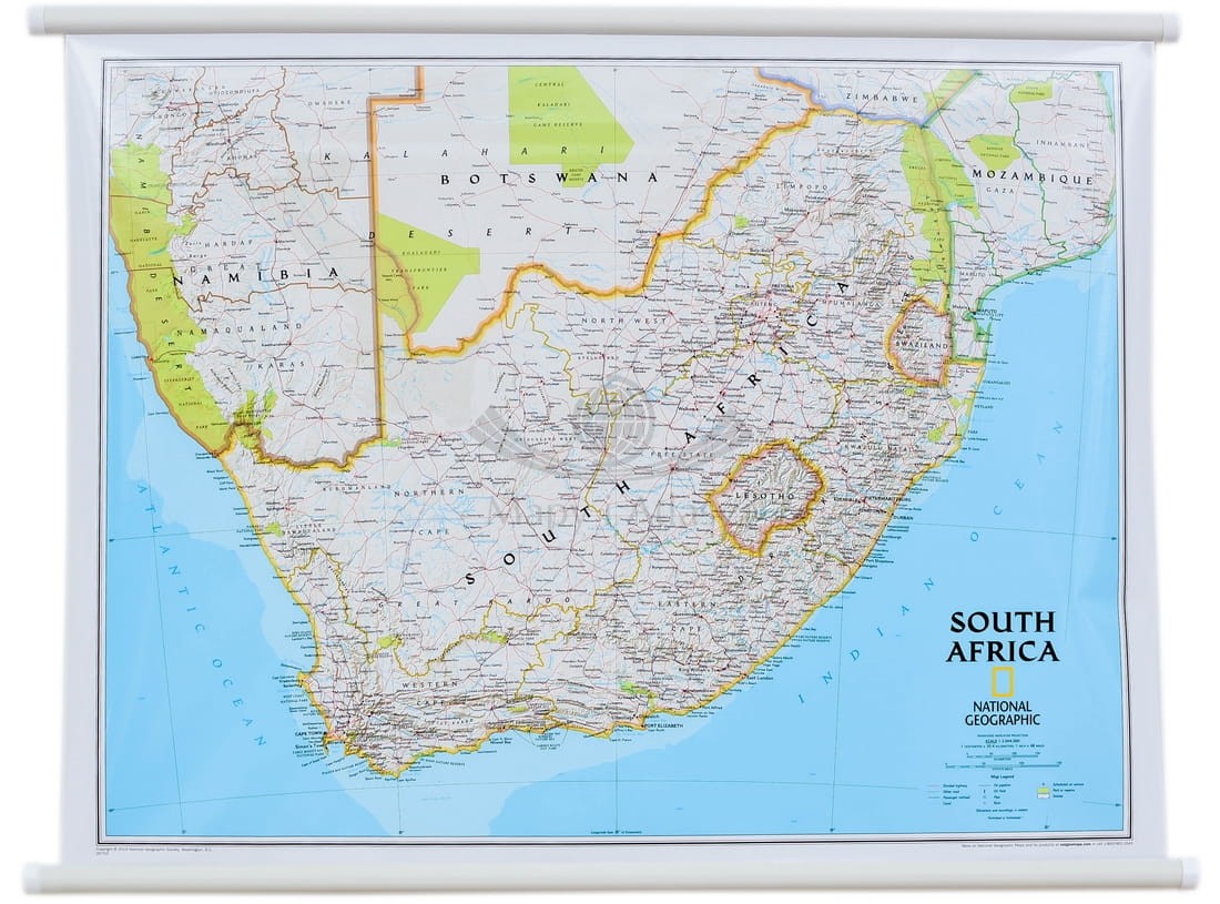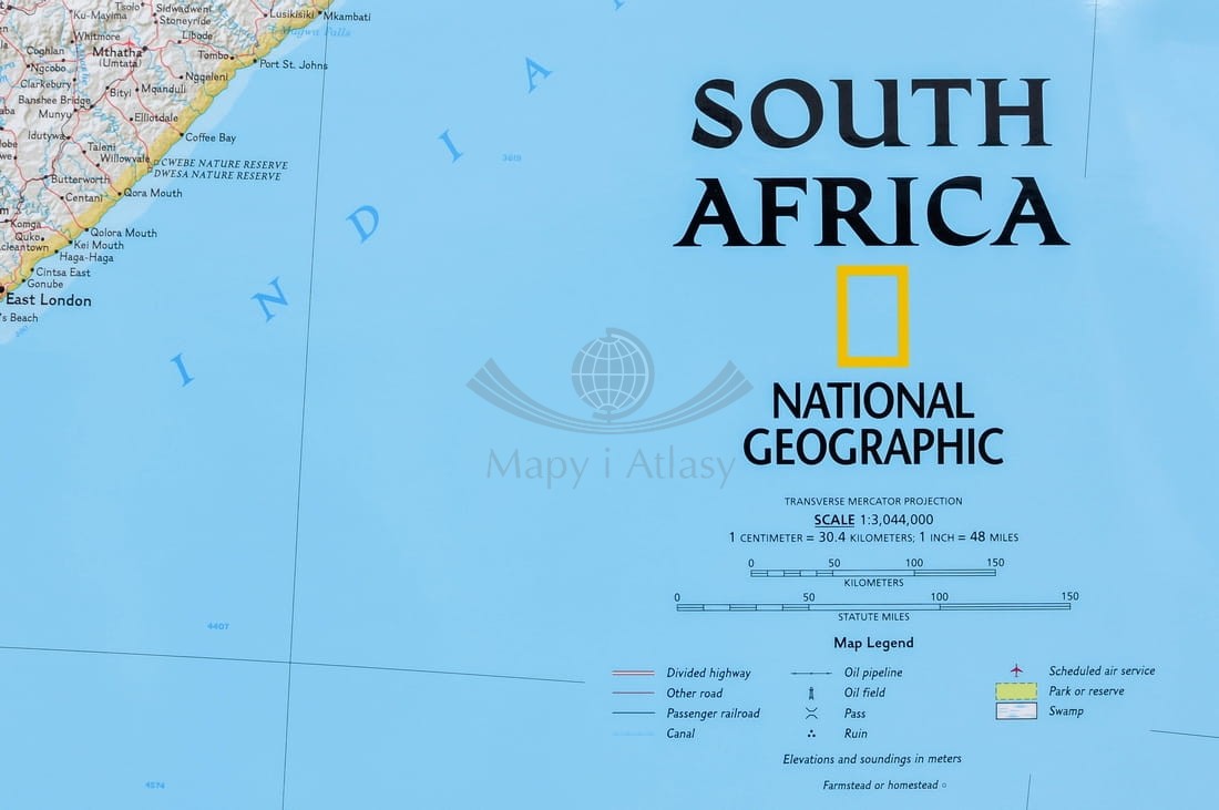 Ścienna mapa Afryki Południowej (RPA) w skali 1:3 044 000 wydawnictwa National Geographic. Mapa zawiera informacje charakterystyczne zarówno dla mapy politycznej, jak i fizycznej.