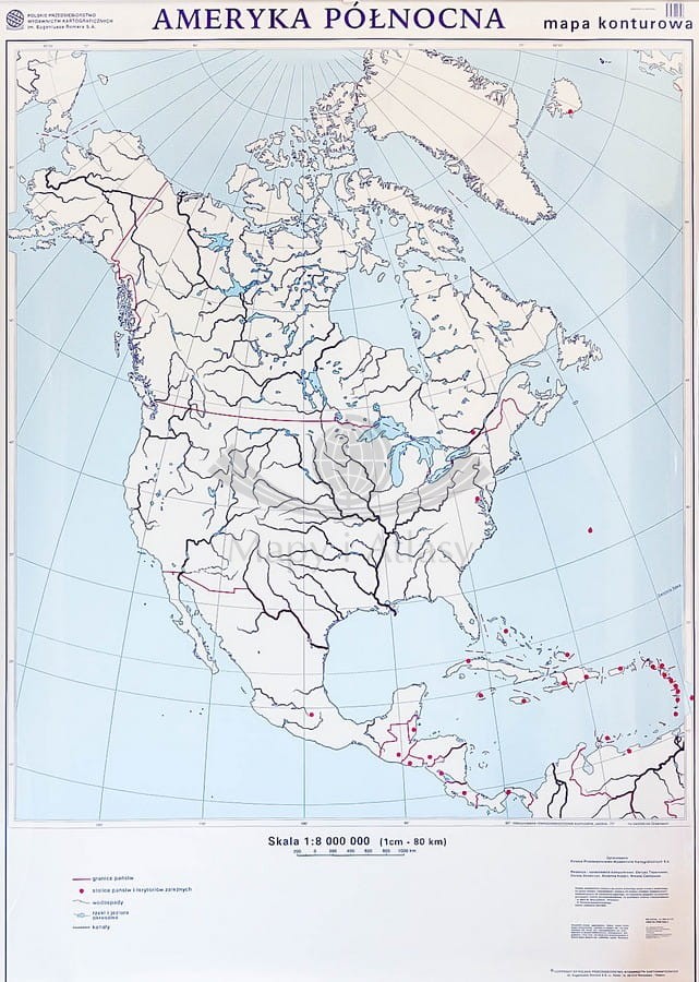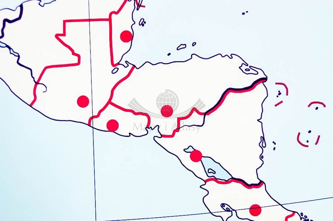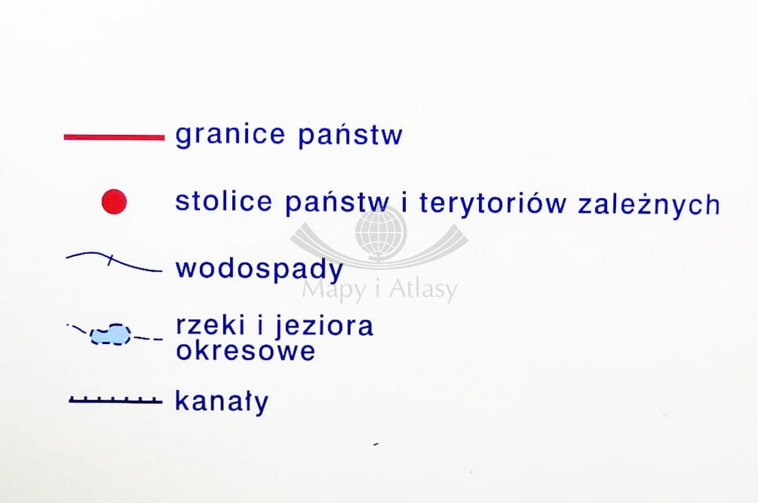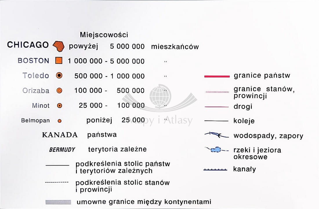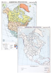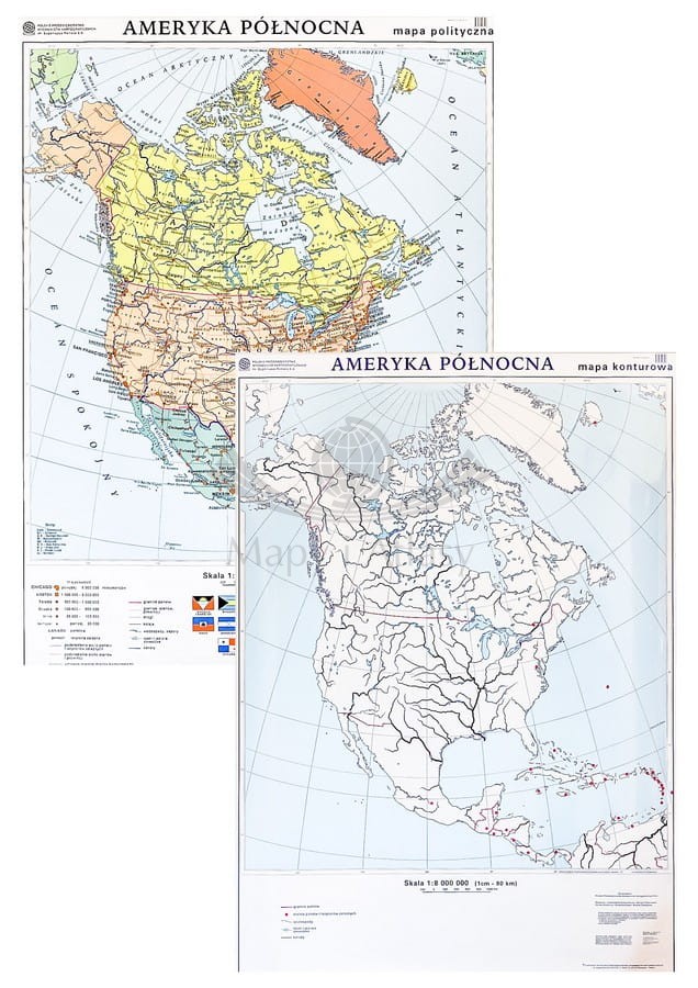 Dwustronna mapa ścienna szkolna Ameryki Północnej w skali 1:8 000 000 wydawnictwa Nowa Era. Pierwsza strona to mapa polityczna Ameryki Północnej. Druga strona przedstawia konturową mapę polityczną.