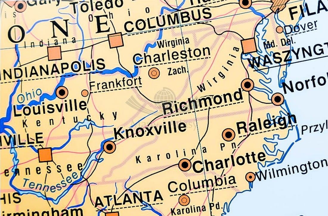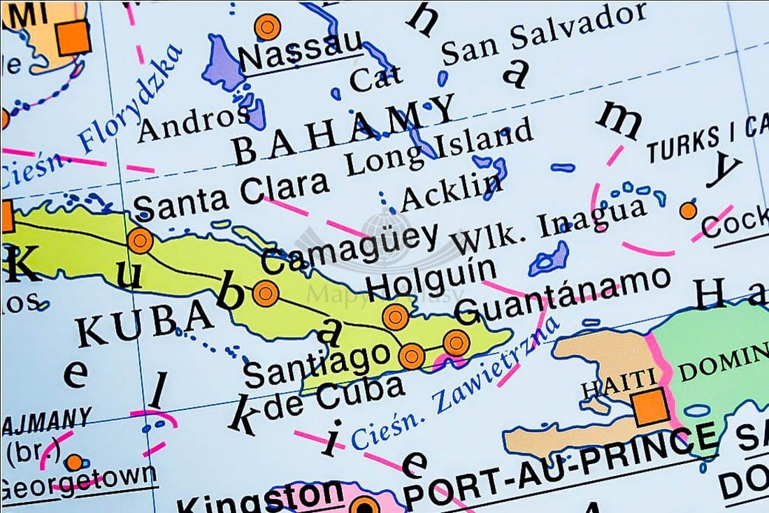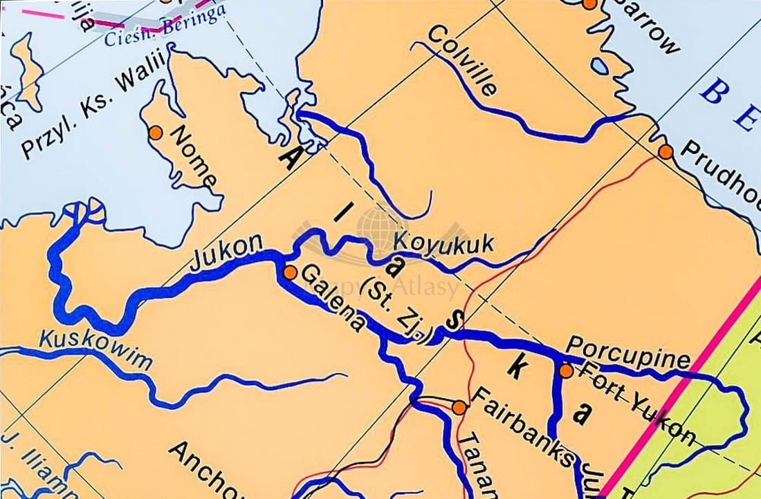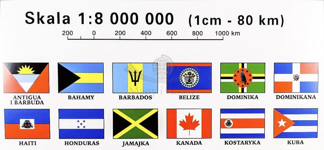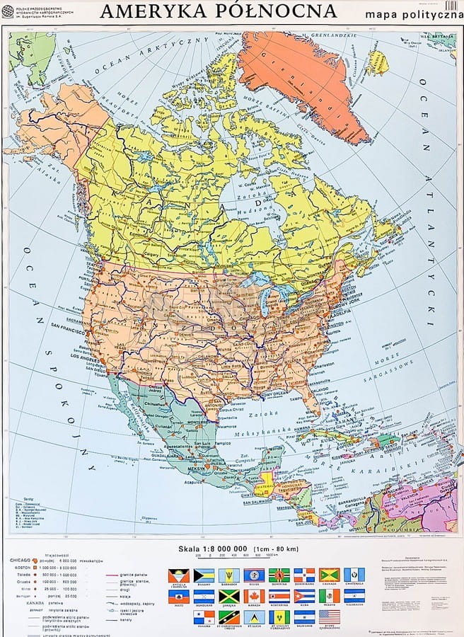 Dwustronna mapa ścienna szkolna Ameryki Północnej w skali 1:8 000 000 wydawnictwa Nowa Era. Pierwsza strona to mapa polityczna Ameryki Północnej. Druga strona przedstawia konturową mapę polityczną.