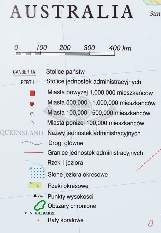 Ścienna, fizyczna mapa szkolna do geografii w skali 1:2 800 000 przedstawiająca ukształtowanie powierzchni i krainy geograficzne Australii. Klasyczna mapa fizyczna została wzbogacona dodatkowo o informacje na temat ochrony środowiska oraz lokalizacje i opisy spektakularnych, australijskich "cudów natury" - obiektów wpisanych na Listę Światowego Dziedzictwa UNESCO.