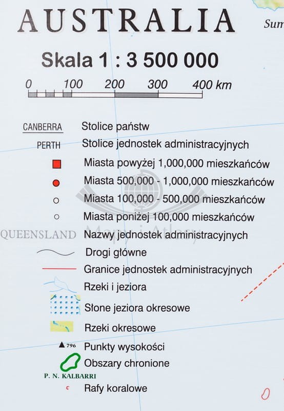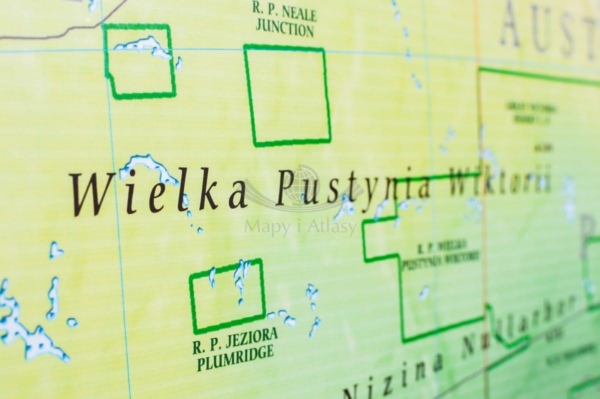 Ścienna, fizyczna mapa szkolna do geografii w skali 1:3 500 000 przedstawiająca ukształtowanie powierzchni i krainy geograficzne Australii. Klasyczna mapa fizyczna została wzbogacona dodatkowo o informacje na temat ochrony środowiska oraz lokalizacje i opisy spektakularnych, australijskich "cudów natury" - obiektów wpisanych na Listę Światowego Dziedzictwa UNESCO.